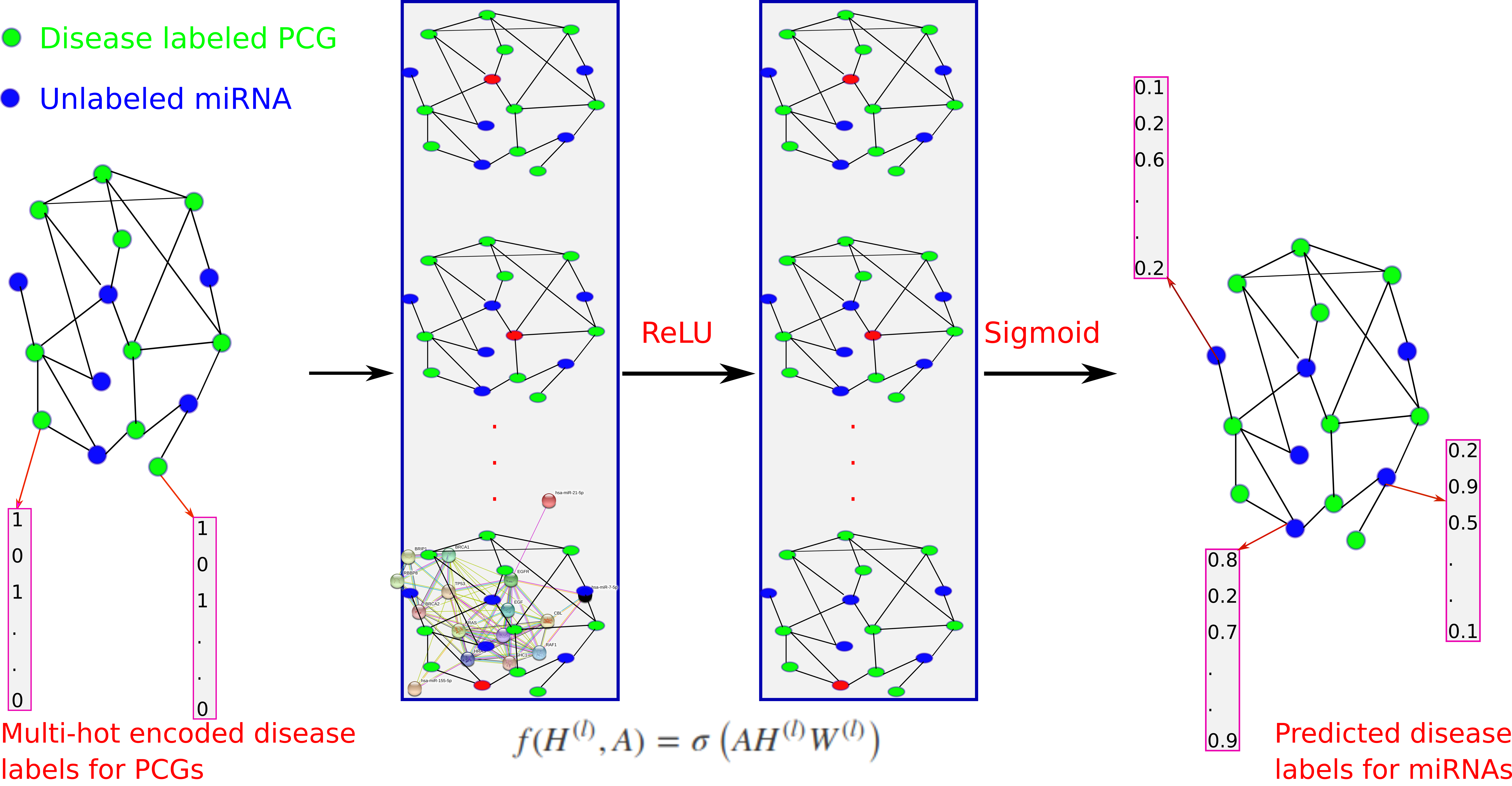 Figure 1. The flowchart of DimiG with 2-layers GCN. Each node (gene) is represented a vector of expression values across tissues from GTEx and the network is constructed from PCG-PCG and PCG-miRNA interactions. When doing forward propagation, the embedding of the red node in each network is the weighted sum of the embedding of its neighbors, where all nodes in the network are updated simultaneously. The label is multi-hot vector indicating the presence of diseases. In the end, DimiG can infer the probability between diseases and unlabeled miRNAs.